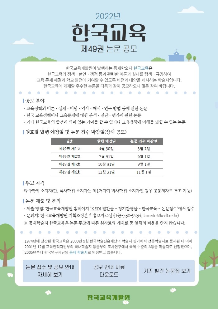 - [한국교육개발원] 등재학술지 한국교육 제49권 게재논문 공모 안내