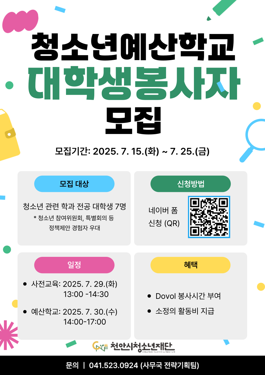 | 천안 [일반] | 「2025년 청소년 예산학교 대학생 봉사자 모집」안내 |