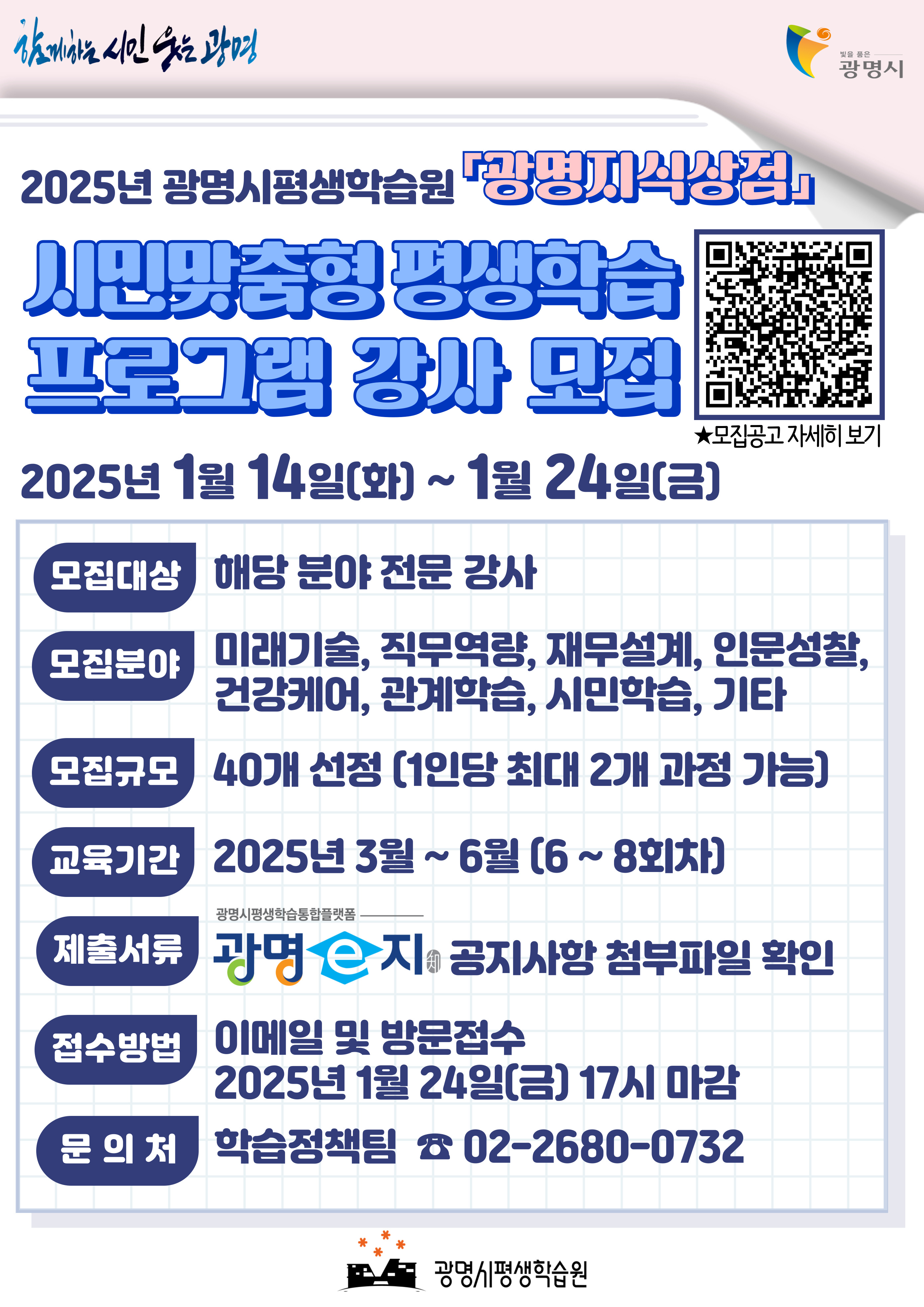 - [채용] [전체대학원] 2025년 광명시 평생학습원 정규프로그램 「광명지식상점」교육강사 모집 홍보