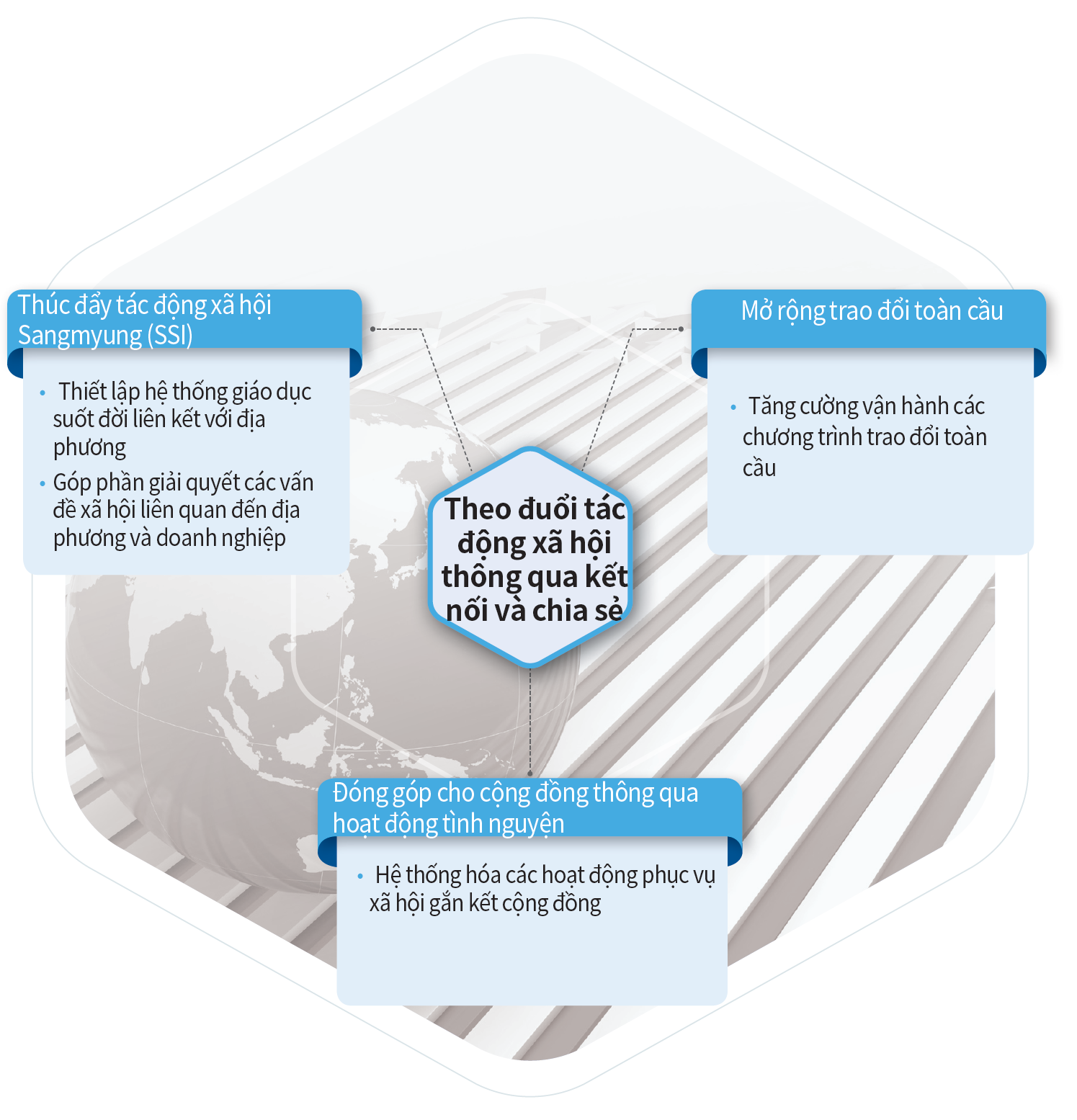 Theo đuổi tác động xã hội thông qua kết nối và chia sẻ Thúc đẩy tác động xã hội Sangmyung (SSI) • Thiết lập hệ thống giáo dục suốt đời liên kết với địa phương • Góp phần giải quyết các vấn đề xã hội liên quan đến địa phương và doanh nghiệp Mở rộng trao đổi toàn cầu • Tăng cường vận hành các chương trình trao đổi toàn cầu Đóng góp cho cộng đồng thông qua hoạt động tình nguyện • Hệ thống hóa các hoạt động phục vụ xã hội gắn kết cộng đồng
