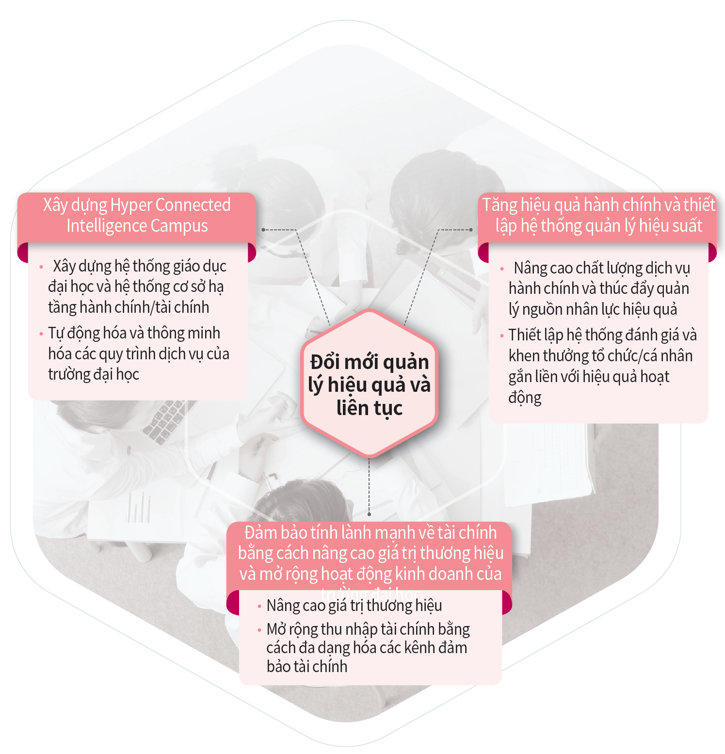 Đổi mới quản lý hiệu quả và liên tục Xây dựng Hyper Connected Intelligence Campus • Xây dựng hệ thống giáo dục đại học và hệ thống cơ sở hạ tầng hành chính/tài chính •Tự động hóa và thông minh hóa các quy trình dịch vụ của trường đại học Tăng hiệu quả hành chính và thiết lập hệ thống quản lý hiệu suất • Nâng cao chất lượng dịch vụ hành chính và thúc đẩy quản lý nguồn nhân lực hiệu quả •Thiết lập hệ thống đánh giá và khen thưởng tổ chức/cá nhân gắn liền với hiệu quả hoạt động Đảm bảo tính lành mạnh về tài chính bằng cách nâng cao giá trị thương hiệu và mở rộng hoạt động kinh doanh của trường đại học • Nâng cao giá trị thương hiệu •Mở rộng thu nhập tài chính bằng cách đa dạng hóa các kênh đảm bảo tài chính